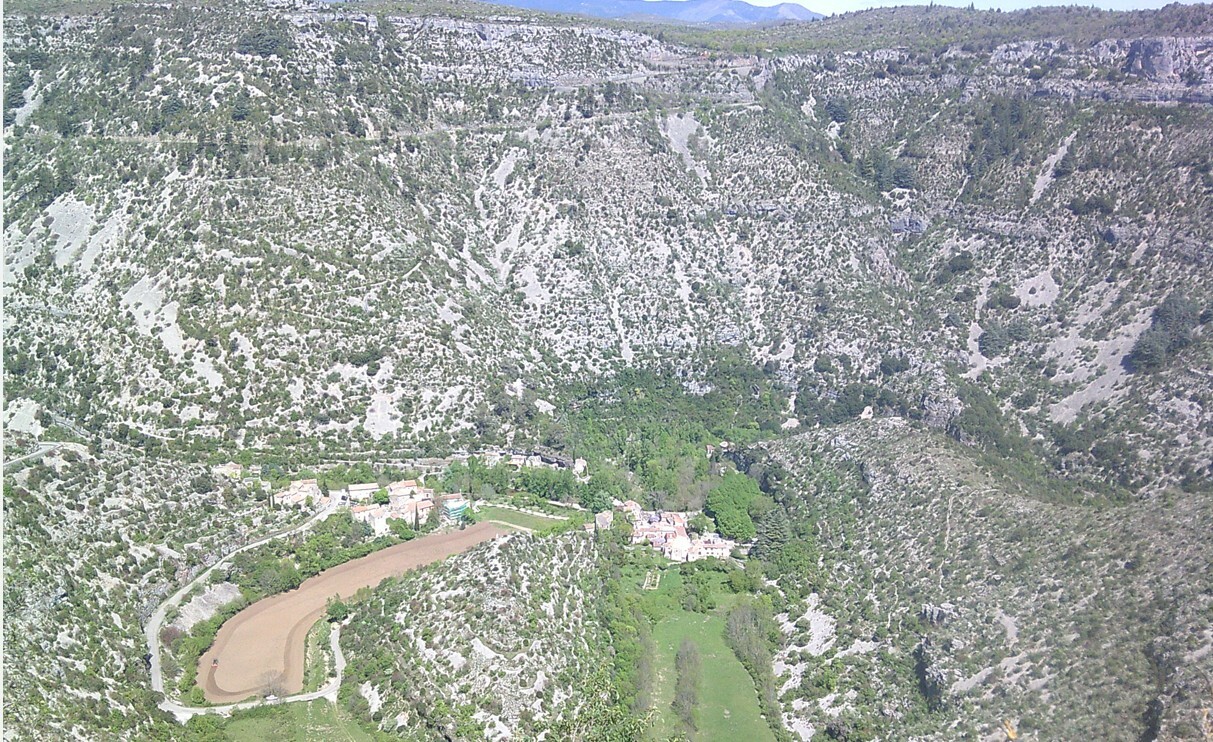 Une belle descente depuis le Belvédère de Blandas, la montée vers la Baume Auriol est un mur titanesque au milieu d'un décor irréel.